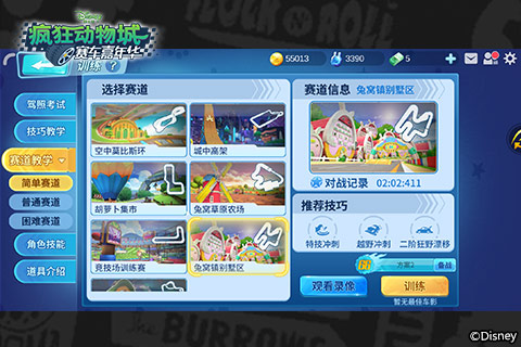 《疯狂动物城:赛车嘉年华》的训练模式中可以看到赛道的分级,其中共有7个简单赛道,它们分别是空中莫比斯环、城中高架、胡萝卜集市、兔窝草原农场、竞技场训练赛、兔窝镇别墅区和藤蔓丛林。玩家可以通过右侧的赛道信息、推荐技巧和教学录像逐步地掌握各赛道。