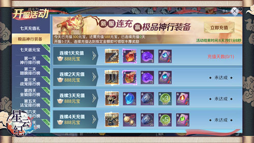 1)极品神行装备,从开服时间算起,计算七天内玩家连续充值达到每日指定元宝数,则可领取对应的奖励。