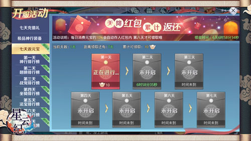 1)活动期间,每日元宝消费的10%会累计存入当日的红包中,当日24时后,当日红包将不再累计。累计到次日的红包中,第8日时,可依次领取所有的红包。(货币为元宝,其余货币消费不累计)