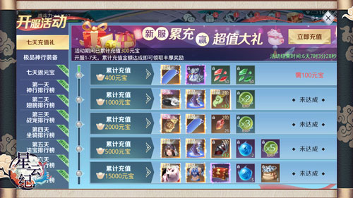 1)七日充值送礼从开服时间算起,累计计算七天内所有的充值(其中不包括交易获得,邮件获得等特殊获得元宝的情况)。