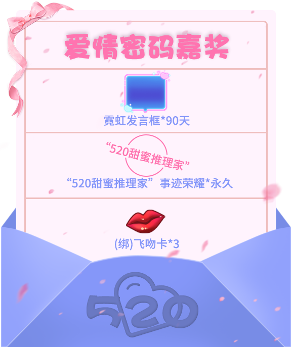 属于最佳推理家的礼物:活动开始后第一位推理出正确答案的玩家,将会和伴侣分别获得“飞吻卡*520”作为奖励,且奖励非绑定!