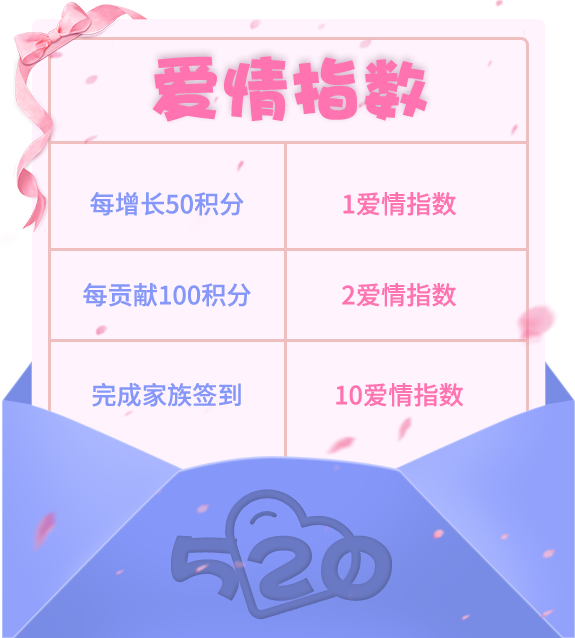 约上你的家族一起来参加520爱情派对吧!活动期间,点击“报名”并通过完成指定任务获得“爱情指数”,赢取丰厚奖励!