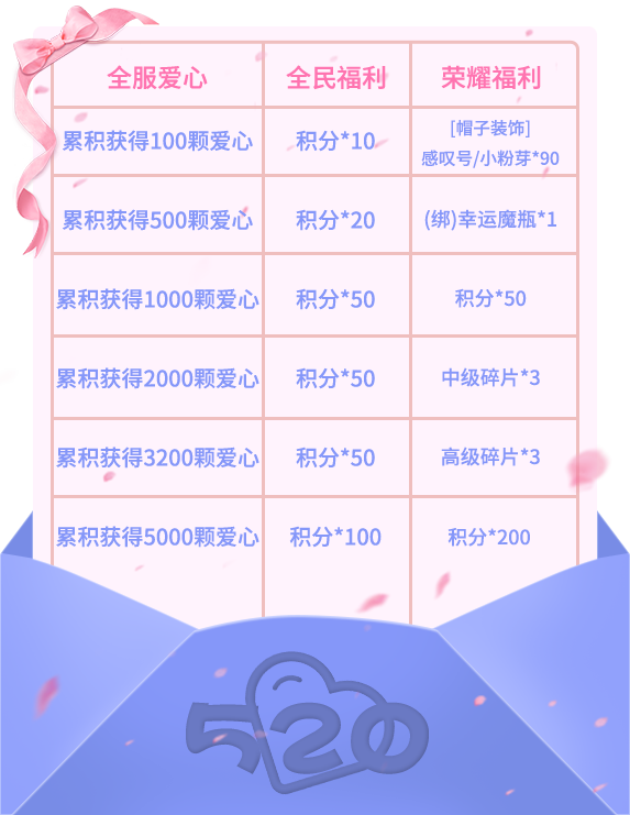 全民爱心:根据全服玩家累积获得的“爱心”总数,所有700积分及以上的玩家可以领取“全民福利”,在活动期间累积获得1颗爱心的玩家,还可以领取“荣耀福利”。