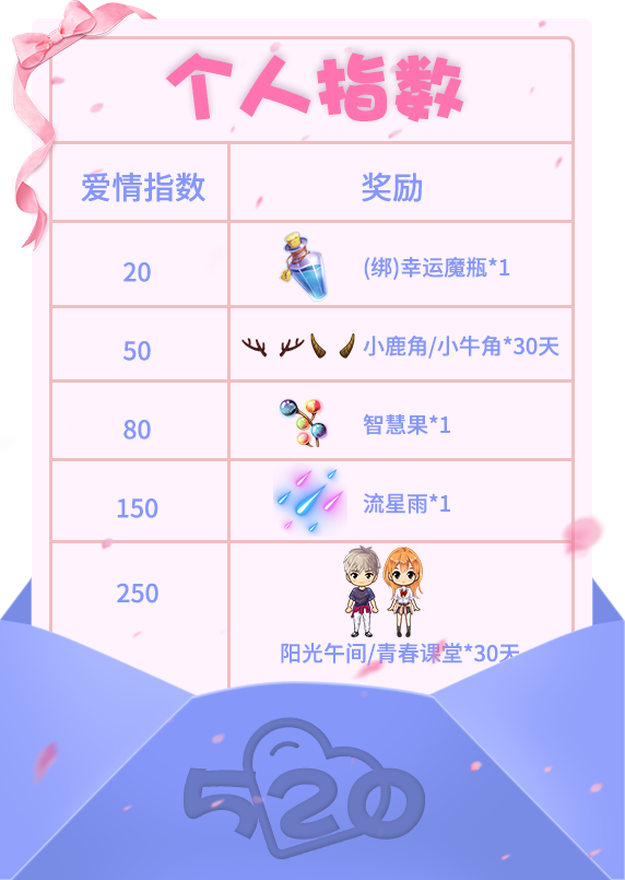 累积您的“爱情指数”以领取奖励(服装按性别获取),奖励与指数累积情况每日刷新,所有奖励每天只能领取一次。