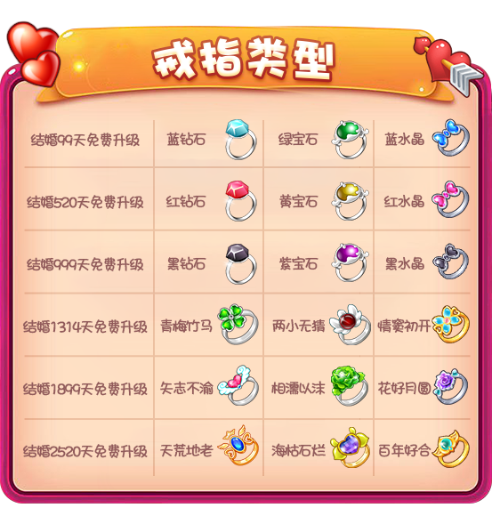 当您的结婚天数达到99天时,就可以免费从“七彩虹”戒指升级到新的戒指啦!现在,您不仅可以从“蓝钻石”和“绿宝石”中挑选您的新戒指,您还可以选择“蓝水晶”成为您与伴侣甜蜜爱情的见证!