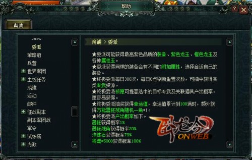 《卧龙吟》中的委派系统曾经是玩家获取装备的重要途径,分为银币委派、金币委派。委派可能获得最高紫色品质的装备、紫色龙玉、橙色龙玉以及各种属性玉。那么终极委派会获得什么呢?