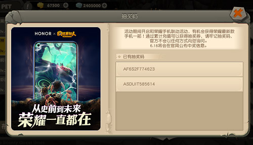 从6月6日开始,《疯狂原始人-正版3D回合手游》会正式开启端午特别活动——华为荣耀20新机福利放送!活动期间,勇士们可以通过荣耀活动来获取特别道具“荣耀活动抽奖券”。每张抽奖券对应一个抽奖码,勇士们获得的奖券越多得到全新华为荣耀20手机的机会也就越大!活动时间将持续7天到6月12日结束,不要错过抢先获取华为荣耀20新款手机的机会!