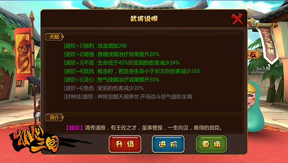 增加武将战力的方式都有哪些?除了装备、宝物、武将等级之外,天赋也是个关键的因素,一条就很屌,点满全部7条就是“屌的7次方”了!因此,各位主公务必把上场武将努力进阶,乃至封神,确保每位武将都点满全部天赋,还愁不能制霸三国吗?《推倒三国》等你来叱咤风云,快快点满天赋,让别人拜倒在你的威名之下吧!