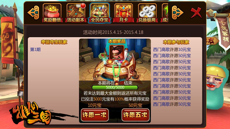 随着本次更新而诞生的最重要的新功能,就是“全民夺宝”玩法的出现。从“活动”进入全民夺宝,即可与大区内所有玩家一起抢夺各类宝物,包括宝物碎片、装备碎片、精炼石、宝箱、钥匙等等,应有尽有。所有参与抢夺某件宝贝的玩家,投入的元宝都会注入奖池,奖池注满后将在所有已投注玩家中随机抽取一位玩家获得该奖品。