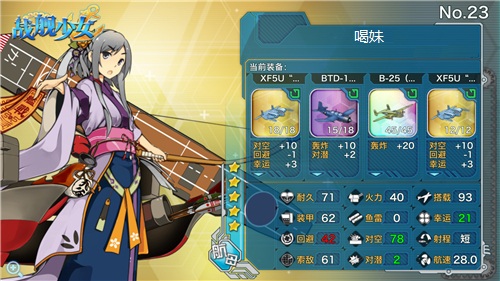 航妈的飞机是《战舰少女》的一大学问,战斗机、鱼雷机、轰炸机的选择和搭配不仅影响输出,更影响“铝”这一宝贵资源的消耗。简单的原则是“敌舰有航妈多战斗机保铝”、“敌舰无航妈多轰炸机求输出”,至于鱼雷机和轰炸机的取舍,多数提督还是偏向于炮击战享受火力加成的轰炸机。