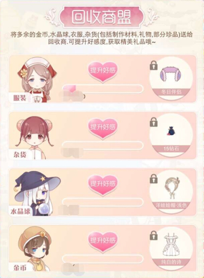 暖暖陪伴大家一起走过了两年多的欢乐时光,在这段日子里,亲爱的暖粉们一定收集了不少暖暖的美装,有没有觉得你的衣柜里已经多得放不下了呀?《暖暖环游世界》里的商人们为了解决大家的困惑,组织起了“回收商盟”,暖粉们可以将多余的金币、水晶球、衣服、各种杂货,包括制作材料、礼物、部分珍品,送给回收商人,提升好感度,提升到一定程度之后,就可以换取精美礼品,全新美装等你来领取哦~