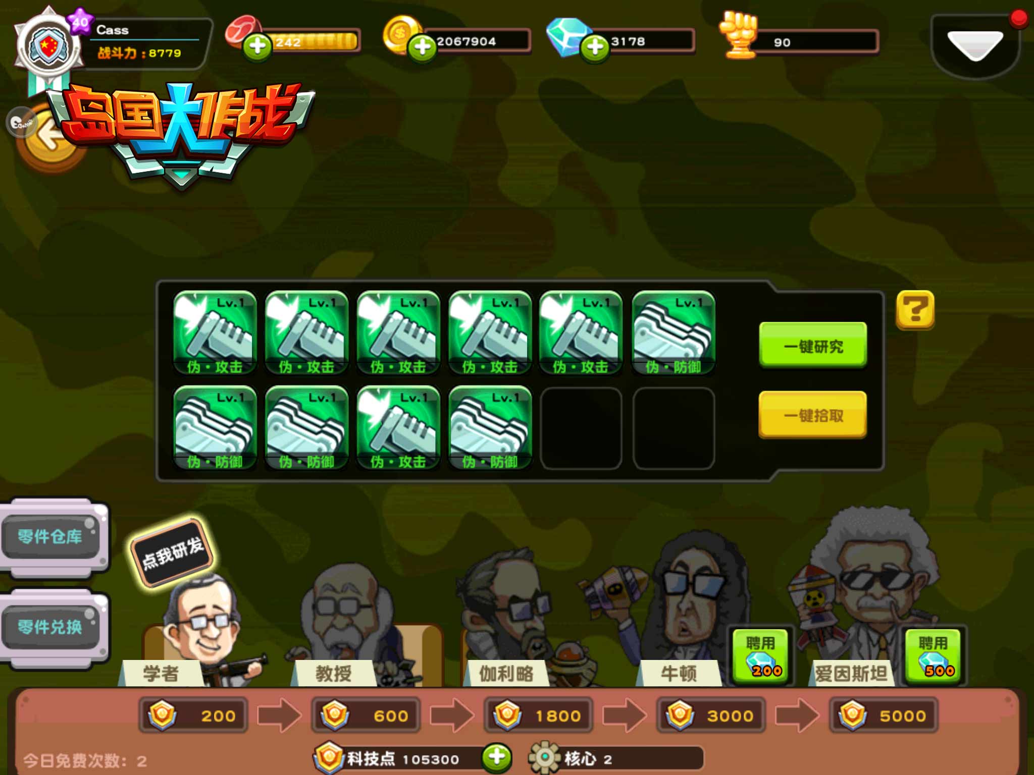 在科研中心进行科研,可以为你的部队装备各种有用的属性,研发这些属性需要使用科技点,而迅速获得科技点的方法就是“科技骰子”,每天可以摇10次,获得大量科技点!