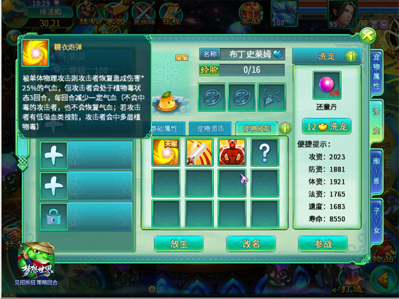 提到布丁,或许你会想到那滑溜溜的甜品。那你可曾想过,布丁竟然是这次的全新宠物呢?《梦想世界》手游全新萌宠布丁史莱姆可爱来袭,无论是软软黄黄与美食布丁完全一样的身躯,还是头上的一小片绿色叶子,又或是攻击时紧张的眯眼表情,每一个细节都让人萌彻心扉。不过千万要注意,布丁史莱姆虽然外表娇小玲珑,但小小的身躯中可是蕴含着巨大的力量,其独特天赋技能“糖衣炮弹”将会让敌人在甜蜜的生命恢复中逐渐迈向死亡,是战斗的得力助手。