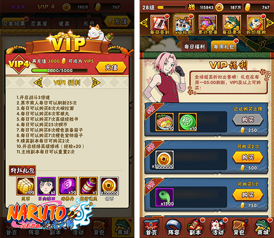 再来看V2,6元+25元月卡是最省钱的方案,为游戏后期长远考虑,这个方案可以说是最划算的。当然,忍币*200、上忍手里剑*1、培养丹*80、高级通灵卷轴*1、铜币*20w的特权礼包,也是物超所值的。