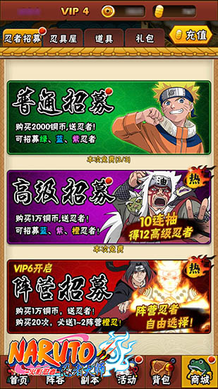 在《火影忍者-忍者大师》忍者进阶初期,我们先来看以下几档充值:V1(6元)、V2(30元)、V3(100元)、V4(200元)。