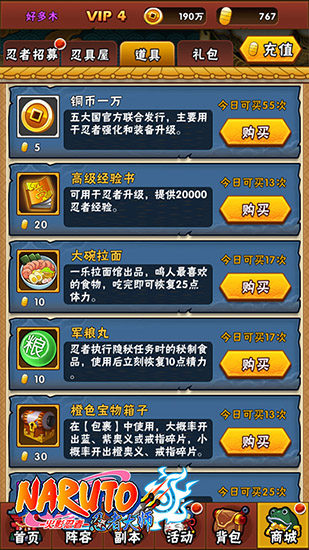 V1、V2、V3每天大碗拉面、军粮丸可以买满,可以及时补充刷副本需要的体力,以及夺宝需要的精力。中R以上等高V,可以适当买更多,因为前期级别就是力量!