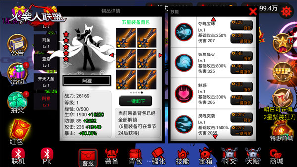 《火柴人联盟》安卓版在1岁生日之际,强势推出“火柴人宝藏”玩法。只要你拥有3个以上(包含3个)英雄,就可进入神秘新领域探寻传说中的秘宝。在火柴人宝藏玩法中,机遇和危险同在。玩家既能挖得宝箱,也会落入死亡陷阱,甚至还会遭遇窃贼、强盗的袭击。不过,大家无需害怕,只要你有足够的胆识、能力,以及些许运气,就能战胜所有困难,获得终极神秘大奖!